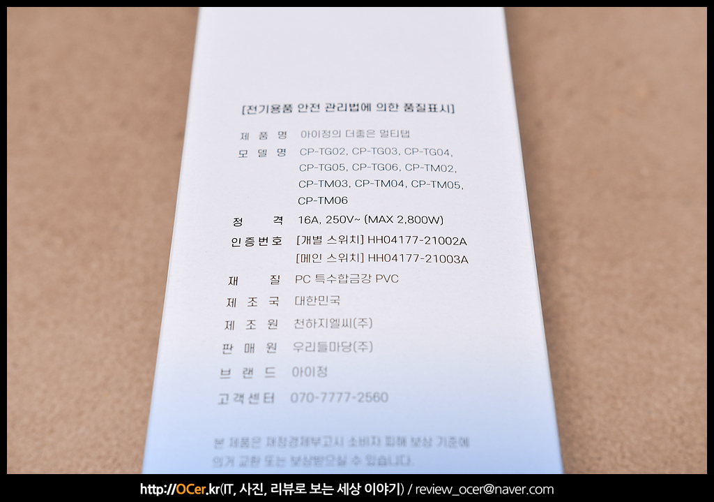 아이정 더 좋은 프리미엄 멀티탭의 모델은 위와 같이 10가지 모델이 출시되었으며, 전기적인 스펙은 모두 동일합니다. 재질은 PC, 특수합금강, PVC 가 사용되었으며, 제조국은 당연하게도 대한민국 입니다.