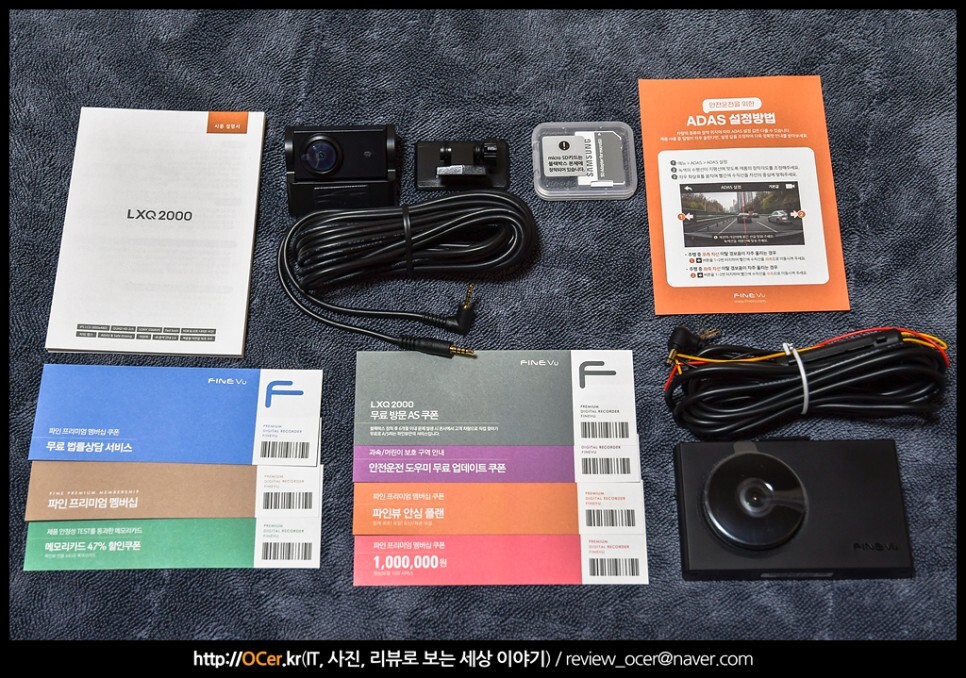 쿠폰 아래에는 파인뷰 LXQ2000 블랙박스 본체와 후방 카메라 및 케이블, 악세사리가 들어 있습니다.