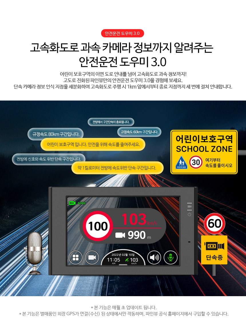 이전 블랙박스에서도 지원했던 기능들이지만 기존에는 과속카메라와, 구간단속, 스쿨존 기능을 제공했었는데, 안전운전도우미 3.0 로 업그레이드 되면서 고속화도로 카메라까지 추가 되었다고 합니다. 하지만 제가 사는 중소도시에서는 고속화도로가 없기 때문에 체험해볼 순 없었습니다.