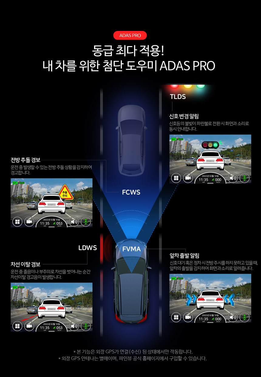 파인뷰 LXQ2000 에서는 이전 블랙박스 모델들 보다 더 많은 안전 옵션을 제공합니다. ADAS PRO 와 안전운전도우미 3.0 이 바로 그 기능인데요. 옵션으로 장착하는 GPS 만 장착해준다면 이 기능들을 모두 사용할 수 있습니다.