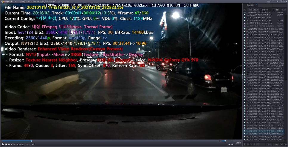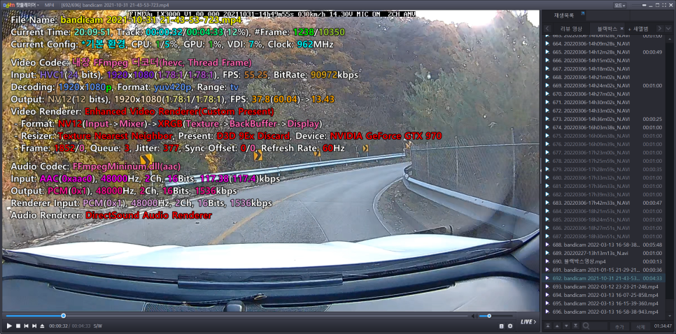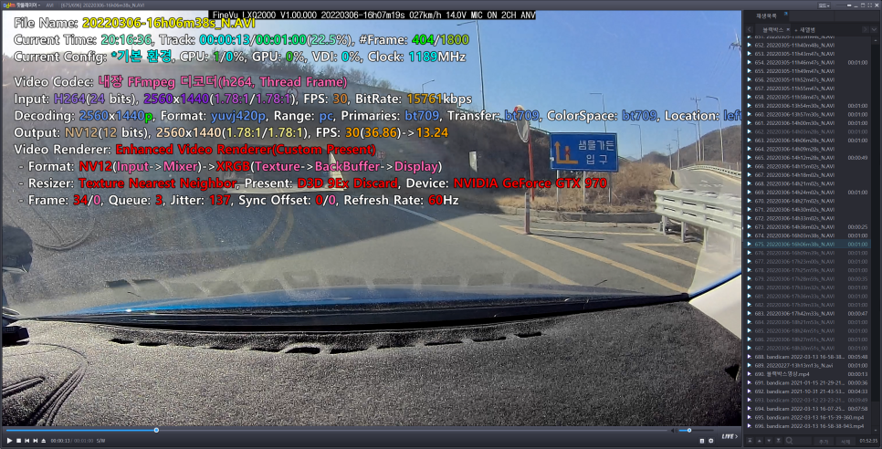 위 이미지는 팟플레이어를 통한 블랙박스 영상 코덱 정보인데, 첫번째가 파인뷰 X30 의 하이퍼랩스 영상 정보이고, 두번째가 파인뷰 X3000 의 스마트 타임랩스 정보 입니다.