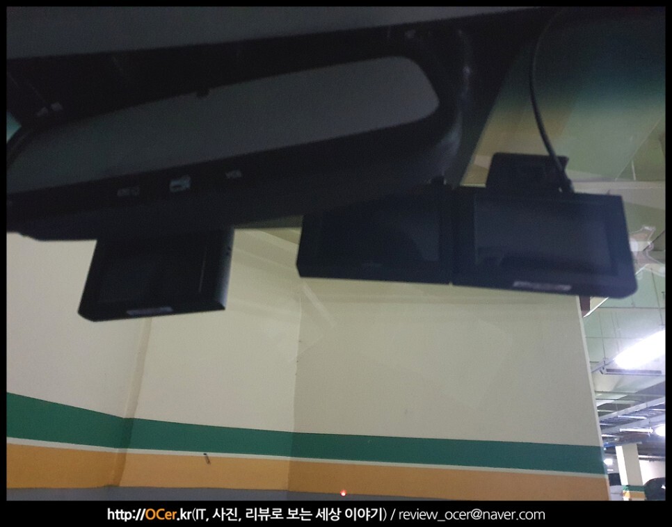 우선 대충 전방의 파인뷰 X5000 자동차블랙박스 위치를 잡아줍니다. 3대의 블랙박스 중 가장 우측에 있는 것이 이번에 설치하고 있는 파인뷰 X5000 입니다.