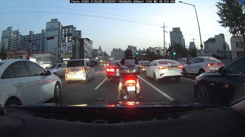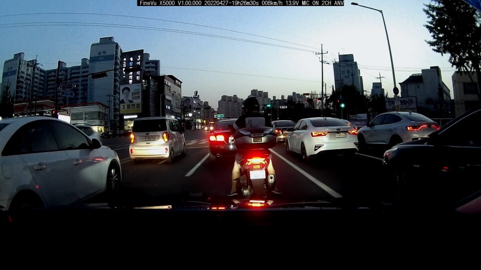 다음 초저녁(?) 대로변에서 대기중일 때 촬영된 모습 입니다. 이때는 아직 밝아서 바로 앞 오토바이 번호판을 제외하고 1차선 레이, 3차선 K3 번호판 모두 깔끔하게 촬영되었습니다.