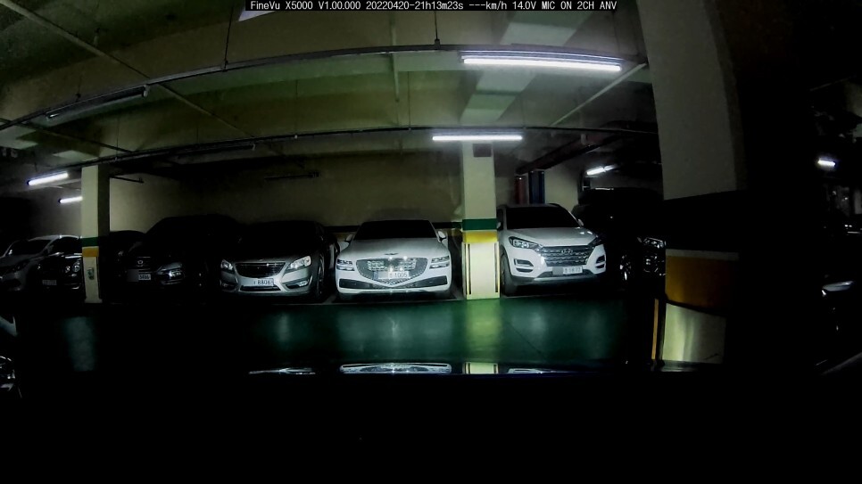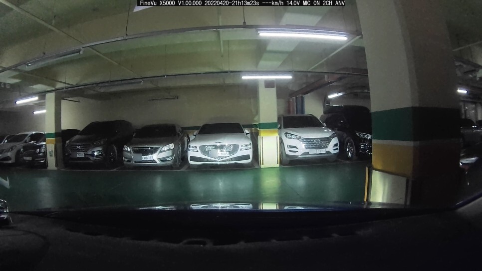 정지된 상태 끝으로 지하주차장에서 주차를 하고 촬영된 번호판인데요. 그냥 봤을 땐 앞에 제네시시를 중심으로 양 옆 차량 까지만 확인이 되는데,좀 어둡긴 하나 구형 K7 옆에 있는 르노 SUV 차량의 번호판도 희미하게 식별이 가능하였습니다.