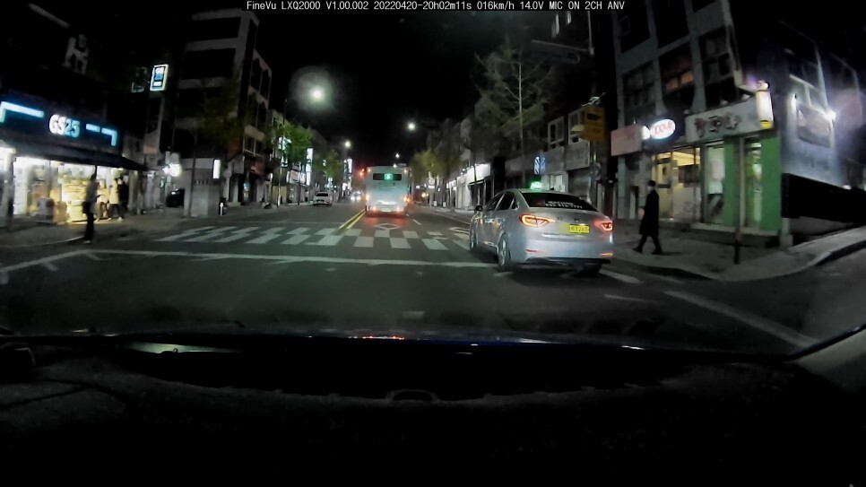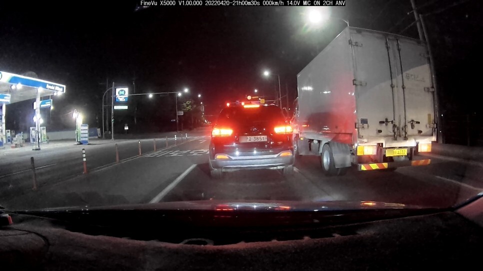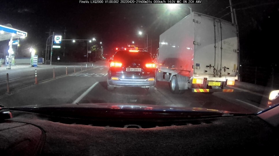비교해본 블랙박스는 옆에 달아놓은 바로 한달 차이로 체험단을 진행했던 파인뷰 LXQ2000 입니다. 위 이미지는 야간이긴 하나, 좀 많이 밝은 가로등이 있는 주변에서 촬영된 결과물 입니다. 이때는 앞차는 물론 번호판 식별이 어려운 트럭의 하단 번호판도 식별이 가능합니다.