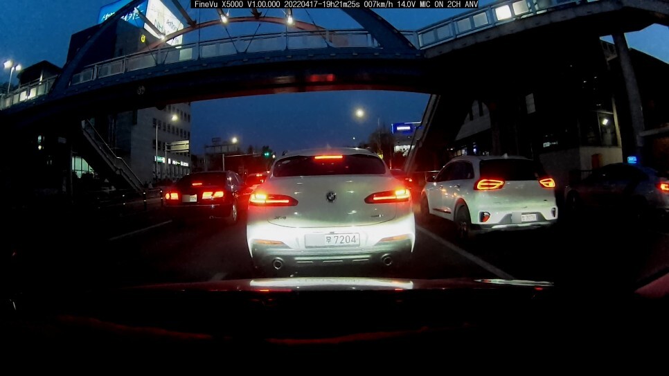 그리고 여기는 그리 밝지 않은 동네에서 촬영된 번호판 이미지인데요. 바로 앞 BMW X4 번호판은 확실히 식별할 수 있지만 우측 니로는 희미하게 가능하고 오히려 저기 멀리 있는 좌측 차선의 그랜져 TG 번호판이 좀 더 또렷합니다.