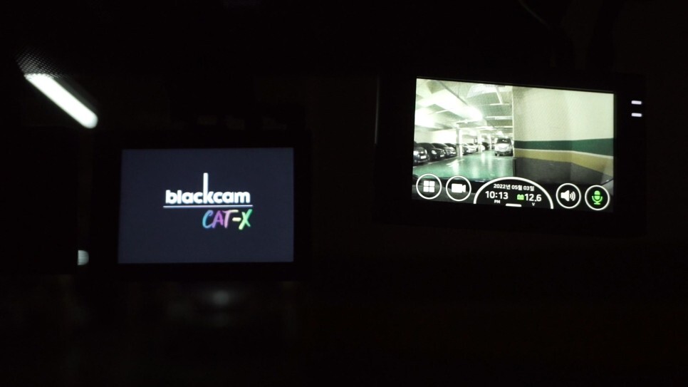 우선 키온 상태인데요. 저는 시동을 걸기 전에 키온 상태에 몇초 머물렀다가 시동을 거는데, 파인뷰 X5000 는 벌써 녹화를 시작 중이고, 블랙캠 CAT-X 는 로고만 보이고 있습니다.