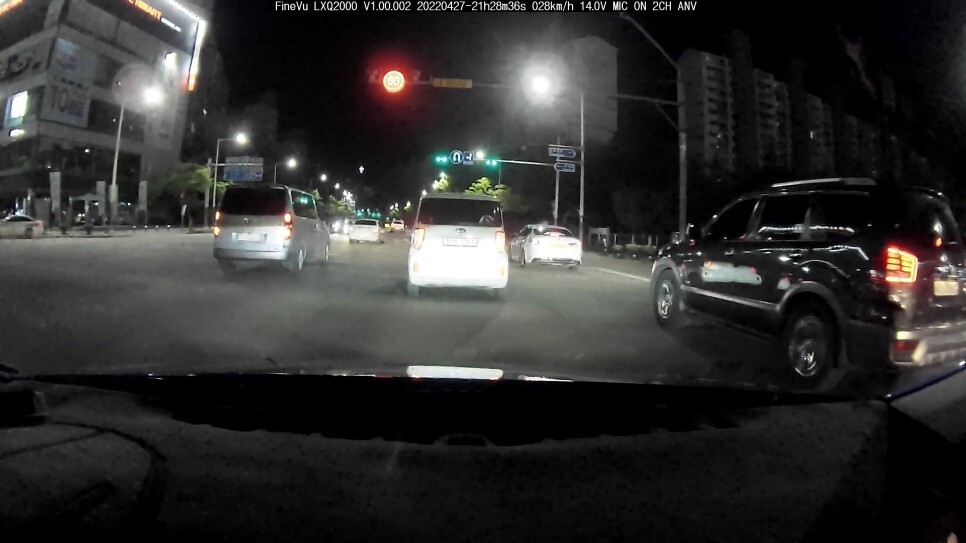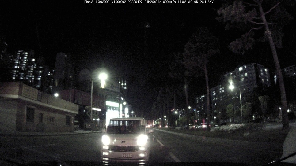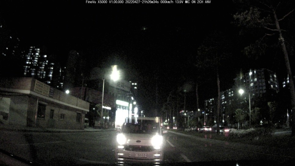 파인뷰 X5000 전방 야간 영상 캡쳐 이미지 입니다. 썬팅은 레이노 S9 35% 이구요. 앞 차량이 제 차량의 LED 때문에 번호판이 안보입니다. 물론 가까이 가면 보이긴 하는데.. 조사각 높이라면 저렇게 심하게 노출오버가 발생하여 보이지 않습니다.