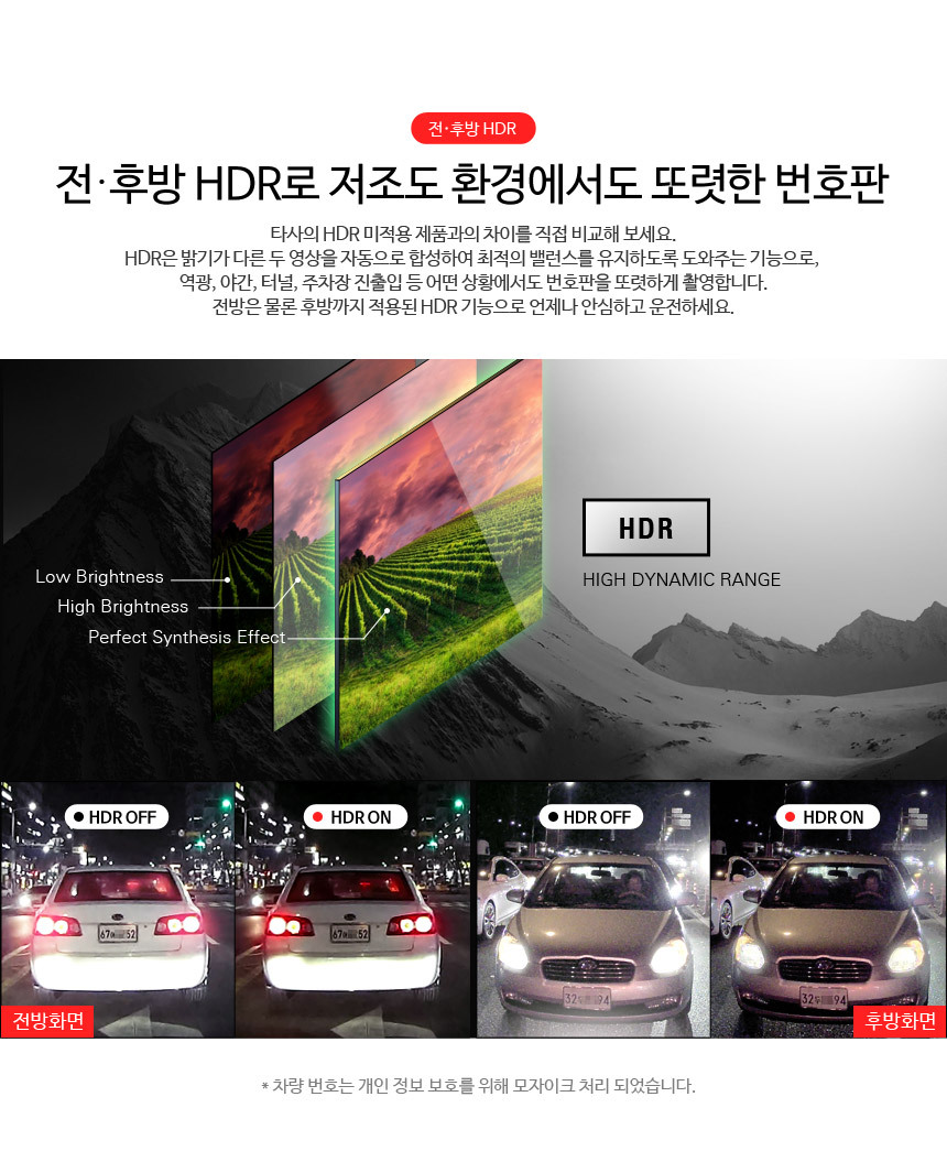 실제로 HDR 기능을 비교해보니, 야간에는 켜두는 것이 좋을 것 같고, 주간에는 끄는 것이 품질에는 더 좋아 보입니다. 사진을 보정할 때도 개인적으로 제가 쓰는 보정팁을 드리자면, 전체적으로 분위기나, 배경이 어두운 이미지는 어둡게, 밝은 이미지는 밝게 해야 좋았습니다. 영상도 마찬가지로 그런 느낌이 좋은데, 주간에는 HDR 을 켜두면, 하늘의 노출오버 되어 하얗게 날아간 부분이 보정되어 품질은 더 좋아 보이지만, 전체적으로 어두운 느낌도 받기에 차라리 번호판과 상관 없는 하늘은 하얗게 날아가버리더라도, 그 외 부분은 살짝 밝은 것이 좋기에, 끄는 것이 좋다고 생각됩니다.