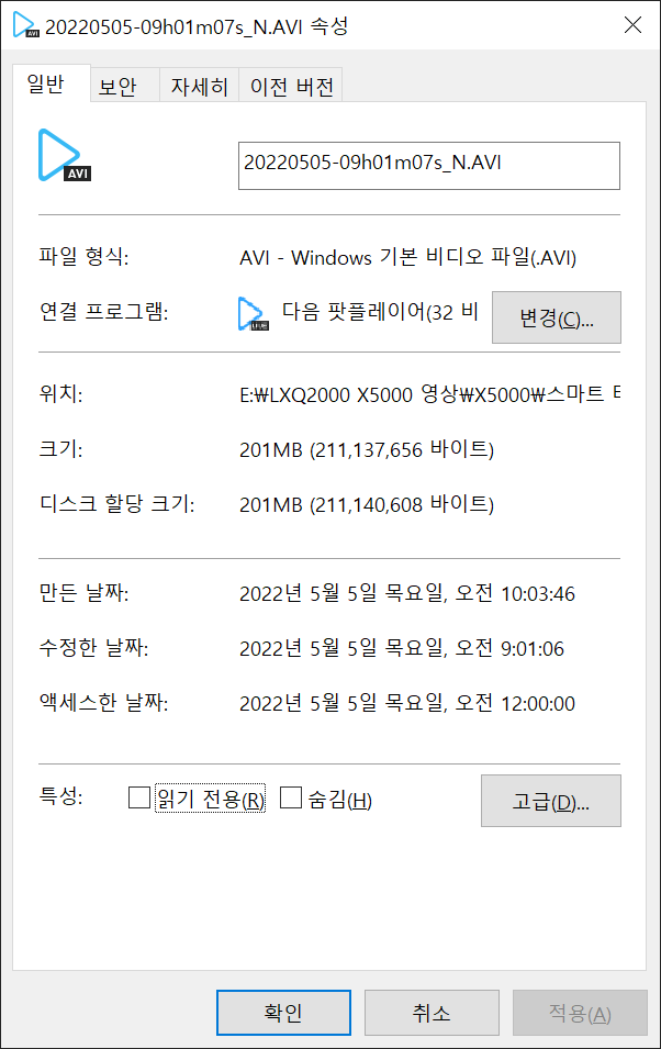 스마트 타임랩스로 촬영된 영상의 크기는 전/후방 합쳐진 파일이 200MB 정도 되네요.
