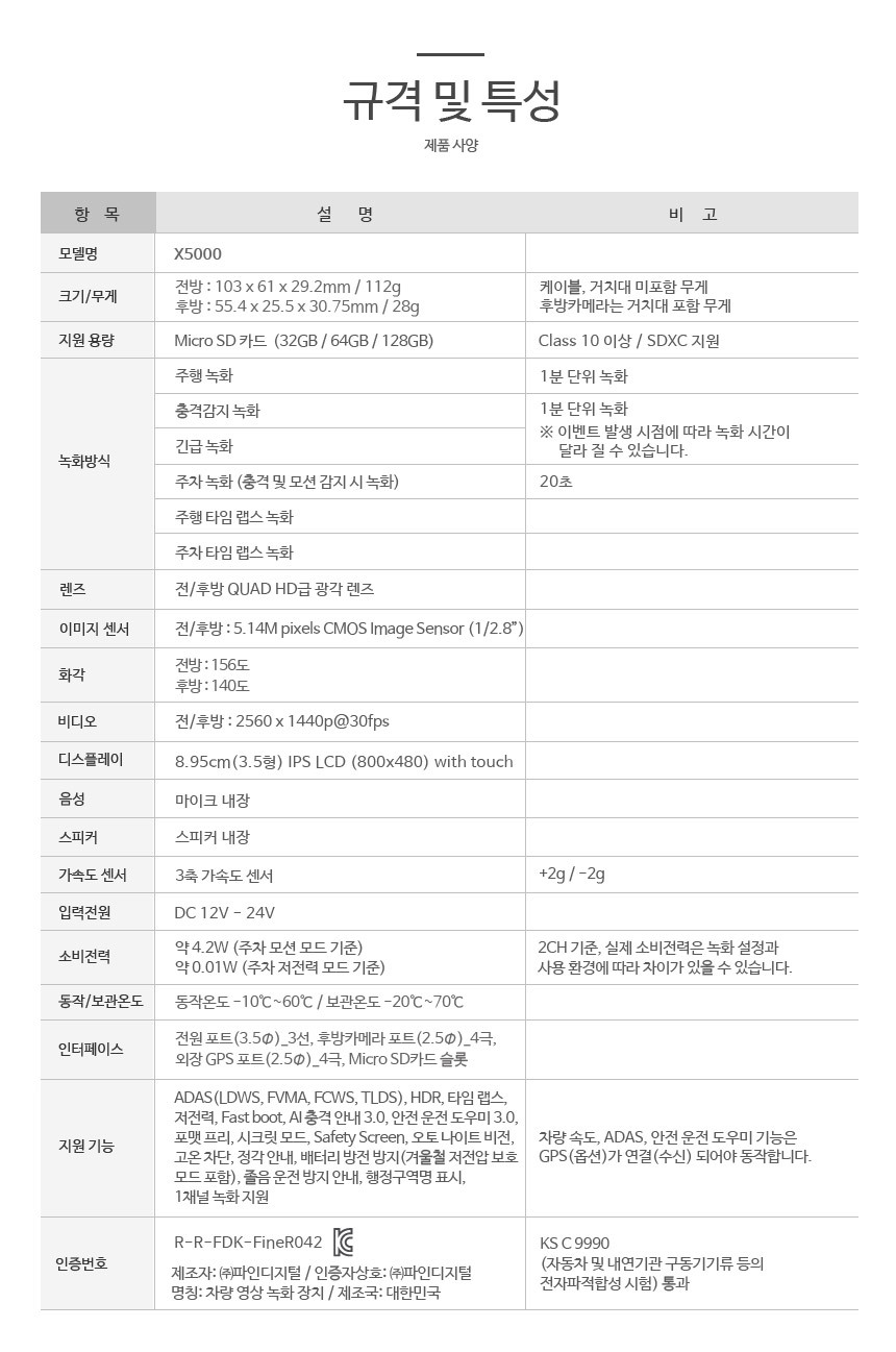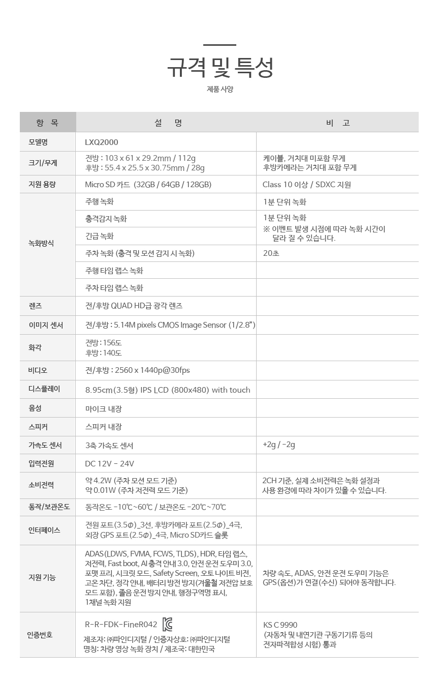 파인뷰 X5000, LXQ2000 스펙 테이블 입니다. 녹하방식, 렌즈, 이미지센서, 화각대, 그리고 소비전력과, 지워 기능까지. 모두 동일하였고, 무엇보다 인증번호가 아예 같았습니다.