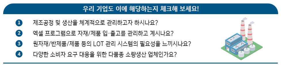 이 중에서 하나라도 해당 된다면 스마트공장지원사업을 통한 MES/ERP/바코드 도입이 꼭 필요한 기업입니다.