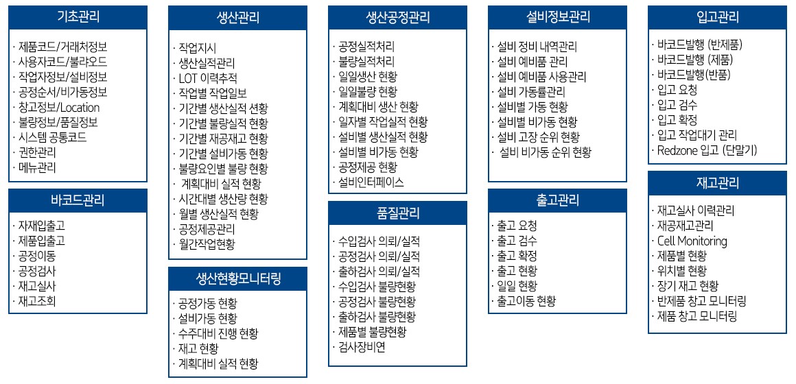 기초관리부터 생산관리, 생산공정관리, 설비정보관리, 입고관리, 바코드관리, 생산현황모니터링, 품질관리, 출고관리, 재고관리까지 제조업에 꼭 필요한 서비스로 구성되어 있습니다.