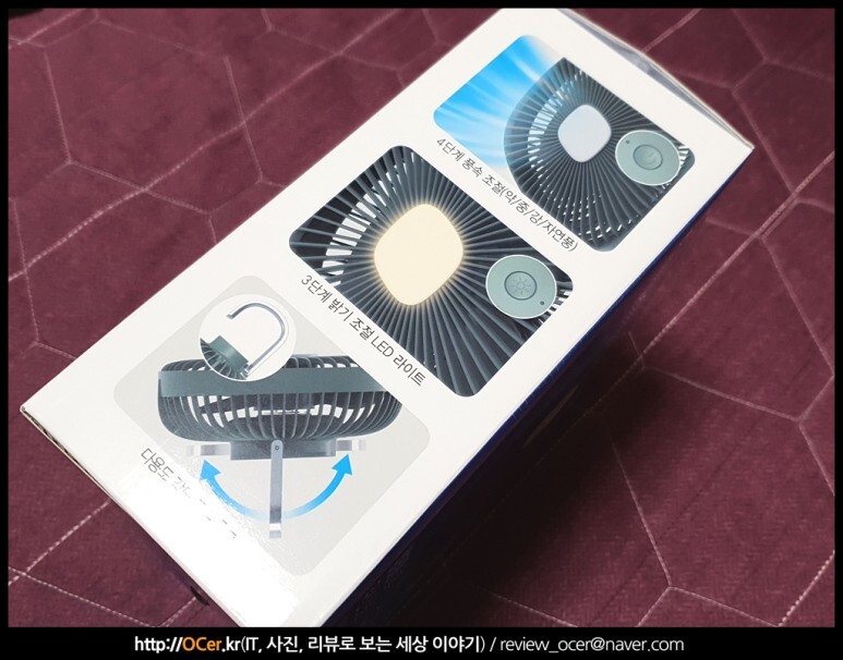 4단계 풍속조절, 3단계 LED 밝기 조절, 그리고 각도 조절 가능한 후크. 등 제품 특징도 확인할 수 있습니다.
