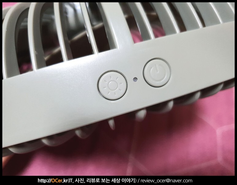 팬가이드상단에는 두개의 버튼이 있는데, 하나는 전원 및 풍속조절 버튼, 그리고 캠핑이나 야외 야간활동시 활용할 수 있는 LED 버튼이 있구요. 가운데는 전원상태를 알 수 있는 satus led 가 있습니다.