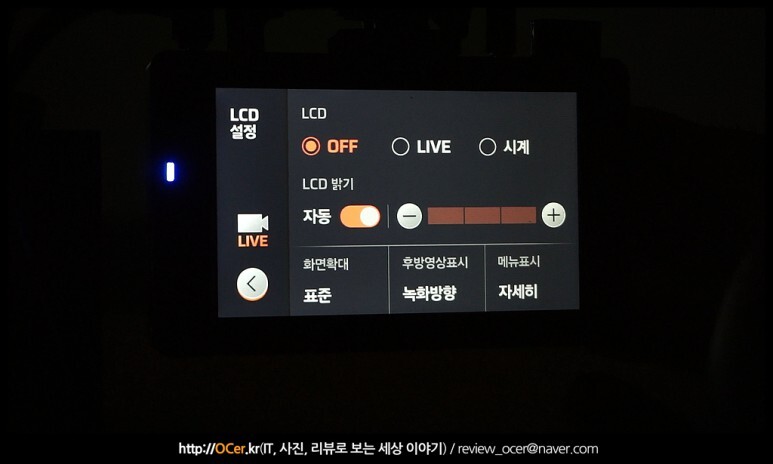 LCD 메뉴로 들어가면 화면 OFF, 라이브뷰, 시계 표시가 가능하며, LCD 밝기를 자동 또는 수동으로 할 수 있습니다. 그리고 보여지는 방식을 화면확대냐, 후방영상 표시를 녹화방향이냐 룸미러 방향이냐, 그리고 메뉴표시를..