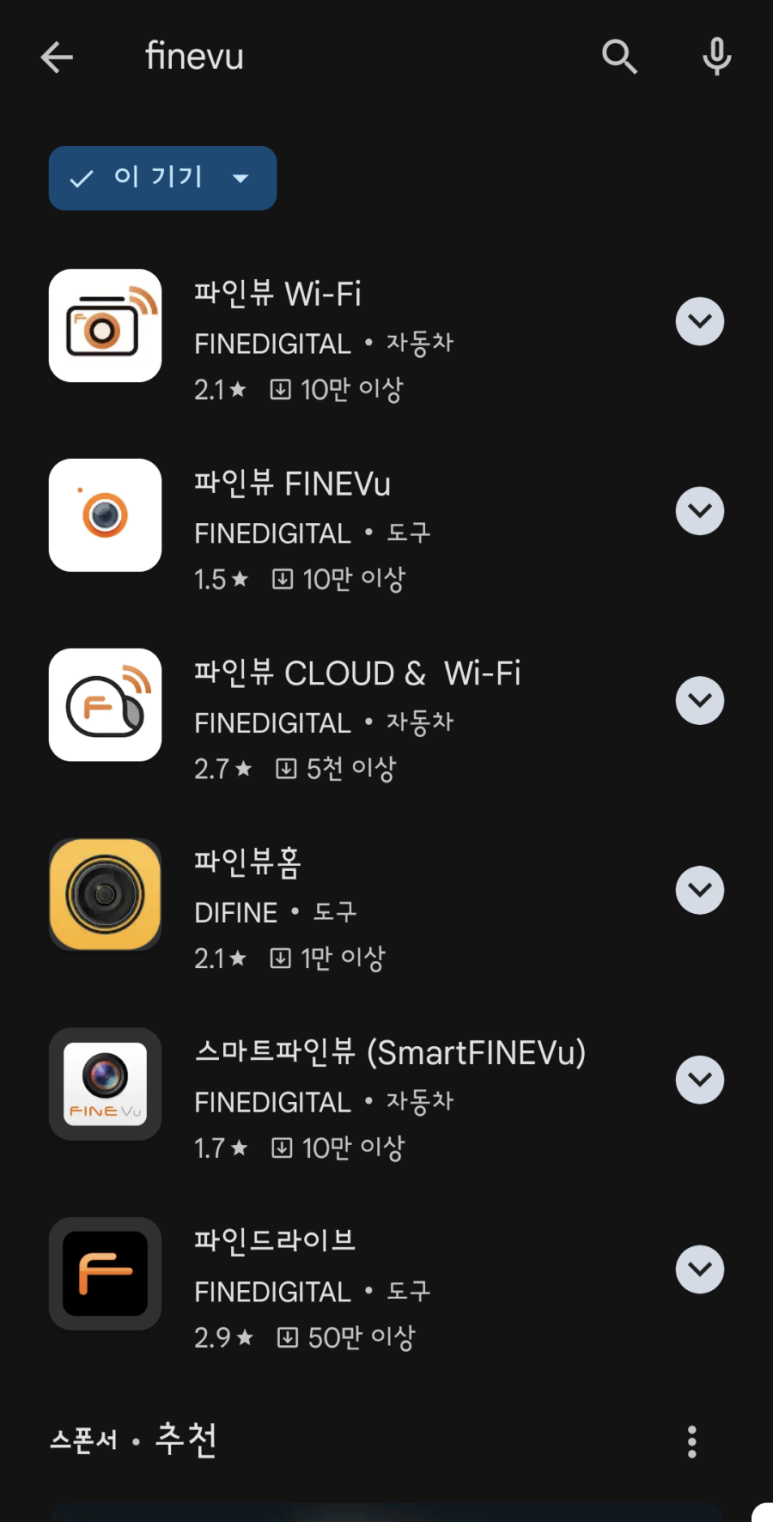 구글 플레이스토어에서 FINEVU 로 검색해보면, 어떤 것을 설치해야 할지 고민되시는 분도 많으실 겁니다. 앱 이름에 와이파이 & 클라우드가 적혀 있긴 하지만, 기존 파인 앱들도 상당히 많은지라, 가능하다면 하나로 통합, 또는 정리되면 좋을 것 같습니다.