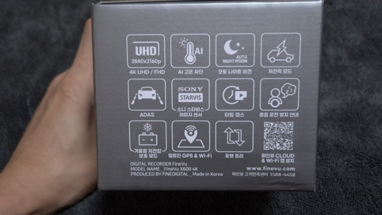 아직 파인드라이브 공식 홈페이지에 파인뷰 X600 4K 제품 페이지가 추가되진 않았으나, 패키징 박스에서 스펙을 대충 확인해 보면 위와 같습니다. 전후방 해상도에 대한 설명은 이미 하였구요.
