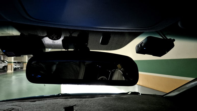 파인뷰 X550 CLOUD는 우측, 블랙캠 CAT-X PRO는 룸미러 뒷쪽에 설치했는데, 운행 후 시야가 좀 가려지는 느낌이 들어 다시 위치를 조정했어요.