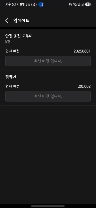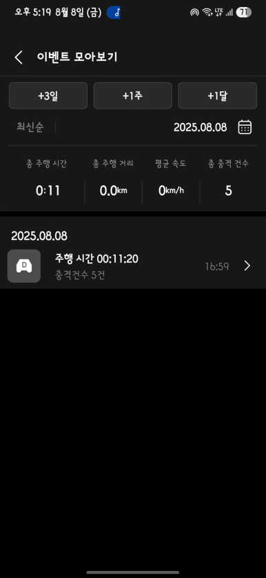 이벤트 모아보기를 통해 주행시간까지 알 수 있고, 이때 충격건수는 몇개인지 확인 가능합니다. 업데이트 화면에서는 안전운전도우미와 펌웨어 버전을 확인할 수 있습니다.