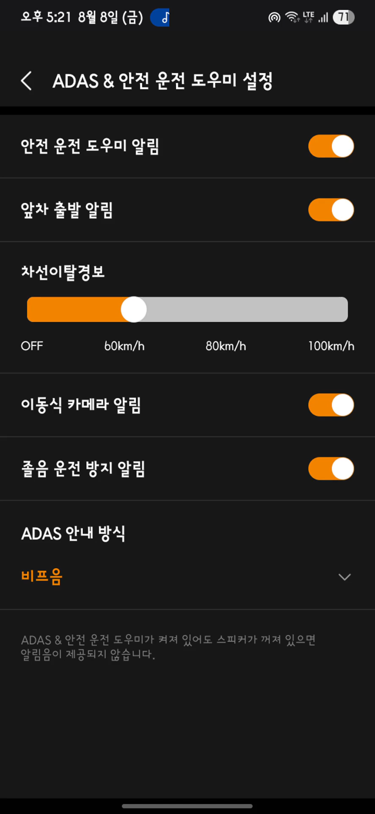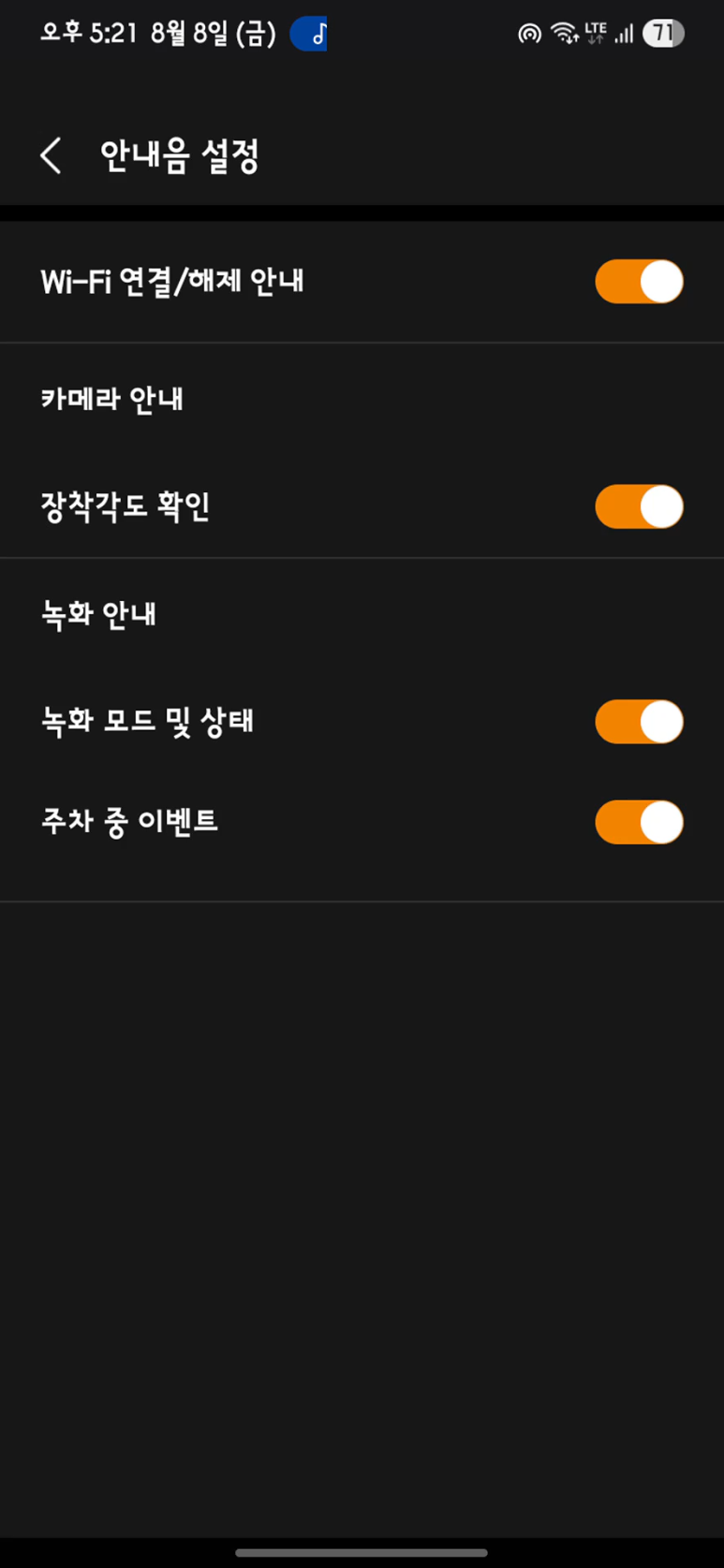 안내음 설정에서는 와이파이 연결/해제 카메라 장착각도 확인, 녹화 관련 안내음을 설정할 수 있는데요. 사용해보니 전체 다 켜두는 것이 좋았습니다.
