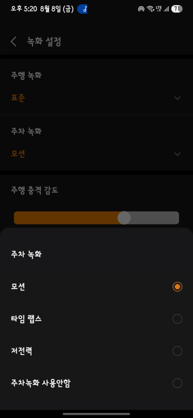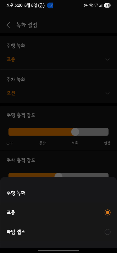 녹화 설정에서는 주행/주차녹화 방식을 설정할 수 있습니다. 주행 녹화에서는 표준, 타임랩스 설정이 가능하며, 주차녹화에서는 모션, 타임랩스, 저전력, 주차녹화 사용 안함 으로 설정할 수 있습니다. 타임랩스는 작은 용량의 메모리카드 및 효율적인 메모리 관리를 위해 압축하여 저장하는 방식으로, 개인적으로 주행 녹화에서 사용하면 드라이빙 영상으로도 활용이 가능하고, 장거리 운행시 좀 더 효율적으로 녹화를 할 수 있게 됩니다.
