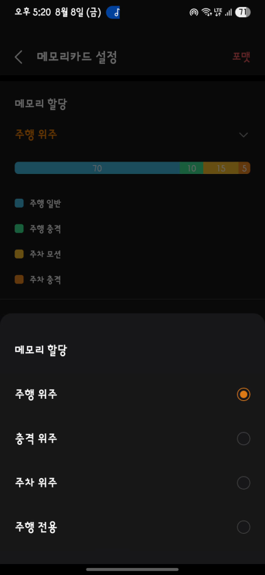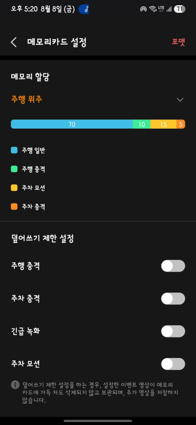 메모리카드 설정에서는 녹화시 메모리 할당 등에 관한 설정을 할 수 있는데요. 덮어쓰기 제한 설정과 주행, 충격, 주차 위주, 주행 전용 위주로 설정할 수 있습니다.