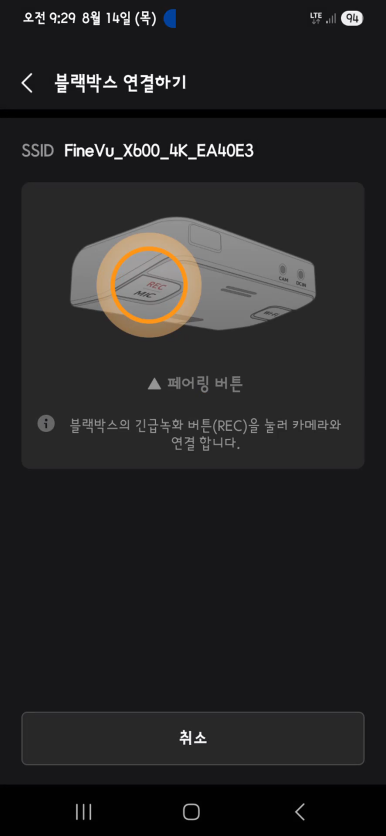 설정을 진행하다 보면 본체의 페어링 버튼(REC) 을 누르라고 합니다. 버튼 눌러주면 페어링 과정이 진행됩니다.