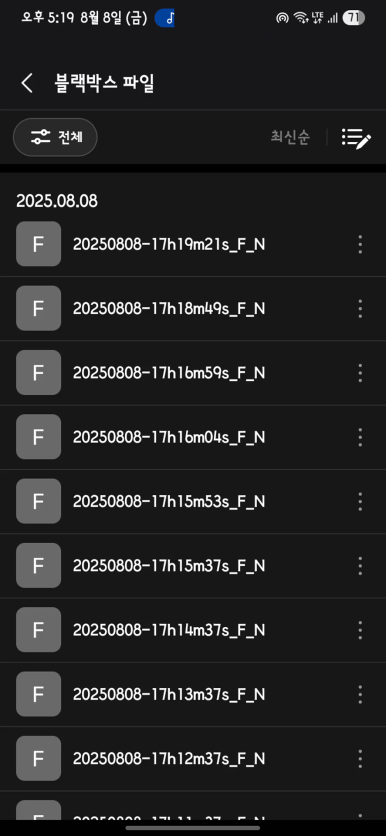 라이브뷰 화면과, 블랙박스 파일 내용 보는 화면 입니다. 영상은 카테고리 별로 볼 수도 있습니다.